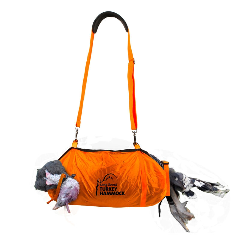 The new Long Beard Turkey Hammock is an innovative way for carrying out your gobbler hands-free. The hammock conveniently contains the wings and legs preventing them from catching on brush and branches during your walk back to the truck. The side strap restrains the head and limits the amount of blood dripping down your backside. The turkey hammock also promotes safety with its blaze orange rip-stop fabric and shoulder strap, which ensure proper visibility to nearby hunters. The blaze orange shoulder strap also doubles as a safety marker to indicate your position in the woods when calling in your long beard. The entire turkey hammock packs into its own attached camo (Mossy Oak NWTF Obsession) pouch and weighs less than 12 ounces. The carabiner clip on the pouch also allows you to just snap it onto your turkey vest. The Long Beard Turkey Hammock is also a great tool for carrying in your decoys in the predawn hours.