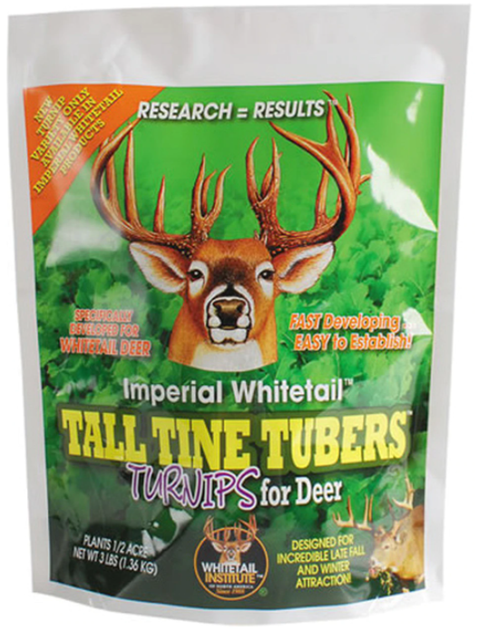 It took six years to develop the new turnip variety in Imperial Whitetail TALL TINE TUBERS. The result is the most attractive turnip variety the Whitetail Institute could develop or has ever tested. TALL TINE TUBERS provides two forage sources for late fall and winter. First is foliage that grows very quickly and becomes sweeter with the fall frosts. Second are sweet tubers that can grow as large as a softball and delivers an additional food source through the winter. TALL TINE TUBERS is designed to establish and grow quickly, produce lots of tonnage, and attract and hold deer during the early and late hunting seasons.